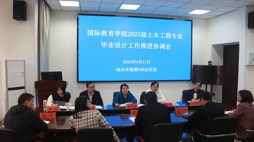 为确保2023届土木工程专业(中外合作办学)本科毕业设计的顺利完成, 4月11日下午,在综合实验楼206会议室,m88 app与国际教育m88 app联合召开2023届土木工程专业(中外合作办学)毕业设计推进会。国际教育m88 app院长李保红、副院长姚光金、副书记付春锋、教学秘书朱妍妍、2023届土木工程专业(中外合作办学)班主任陈璐;m88 app院长周葆春、副院长袁晓辉、土木系主任高春华、教学秘书李卉、毕业设计指导员工代表张伟参会。