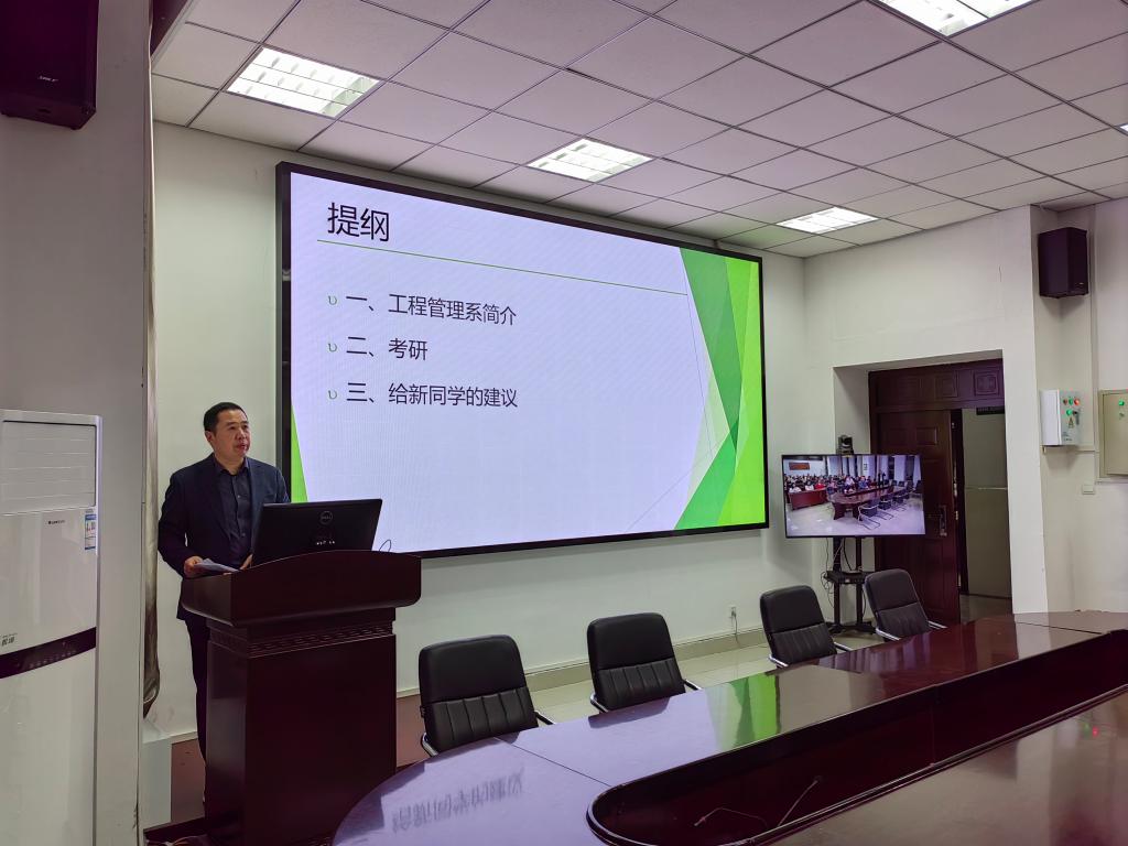 张宗领首先介绍了工程管理系的师资、办公地点、BIM中心,随后介绍了工程管理专业考研的方向、课程、过程及m88 app为同学们考研提供的服务,最后对新同学提出了建议,要求大家以学业为主,树立目标,合理安排时间,营造良好班风学风,不要沉迷手机游戏。
