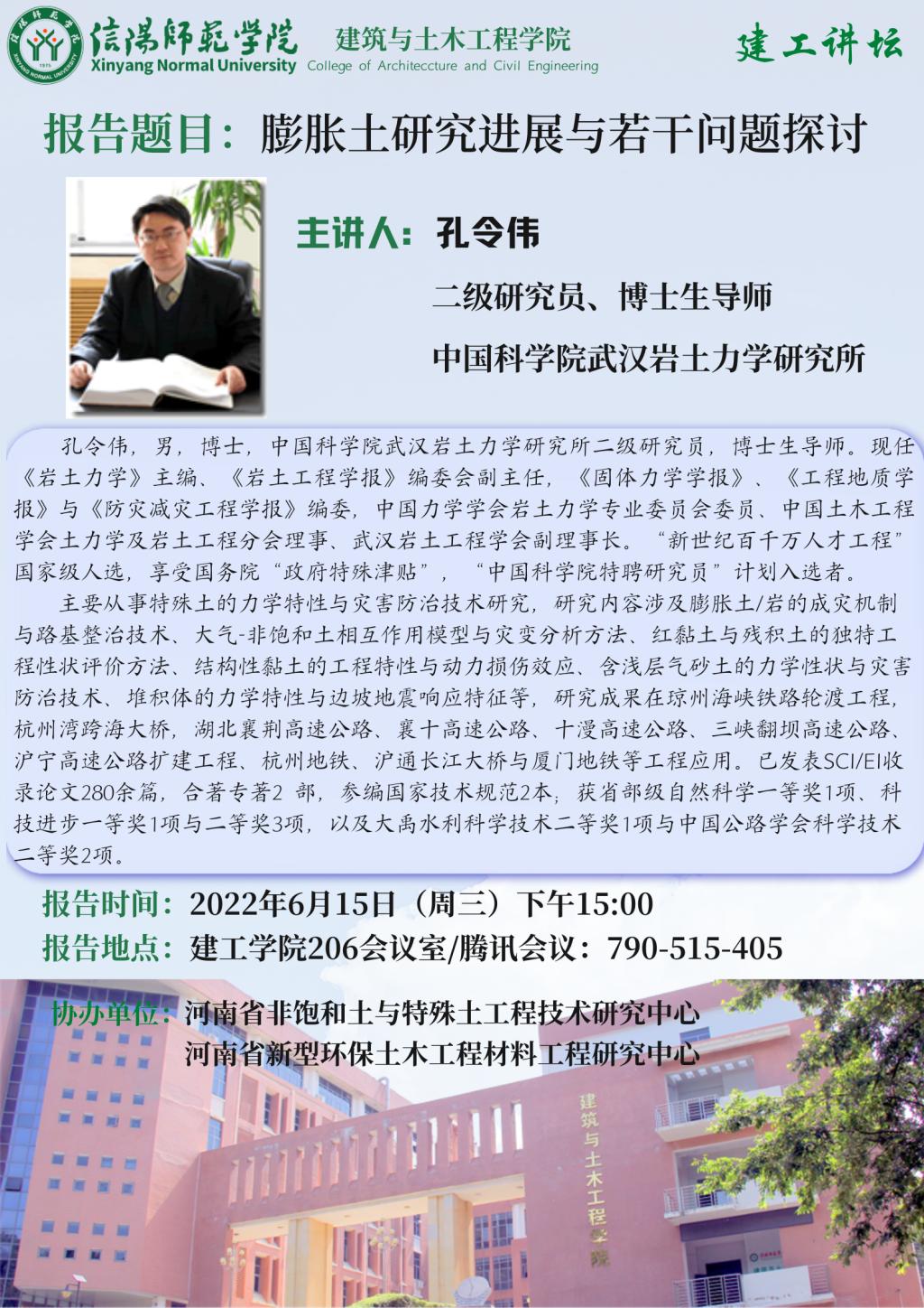 报告人简介:孔令伟,男,博士,中国科m88 app武汉岩土力学研究所二级研究员,博士生导师。现任《岩土力学》主编、《岩土工程学报》编委会副主任,《固体力学学报》、《工程地质学报》与《防灾减灾工程学报》编委,中国力学学会岩土力学专业委员会委员、中国土木工程学会土力学及岩土工程分会理事、武汉岩土工程学会副理事长。“新世纪百千万人才工程”国家级人选,享受国务院“政府特殊津贴”,“中国科m88 app特聘研究员”计划入选者。主要从事特殊土的力学特性与灾害防治技术研究,研究内容涉及膨胀土/岩的成灾机制与路基整治技术、大气-非饱和土相互作用模型与灾变分析方法、红黏土与残积土的独特工程性状评价方法、结构性黏土的工程特性与动力损伤效应、含浅层气砂土的力学性状与灾害防治技术、堆积体的力学特性与边坡地震响应特征等,研究成果在琼州海峡铁路轮渡工程,杭州湾跨海大桥,湖北襄荆高速公路、襄十高速公路、十漫高速公路、三峡翻坝高速公路、沪宁高速公路扩建工程、杭州地铁、沪通长江大桥与厦门地铁等工程应用。已发表SCI/EI收录论文280余篇,合著专著2 部,参编国家技术规范2本;获省部级自然科学一等奖1项、科技进步一等奖1项与二等奖3项,以及大禹水利科学技术二等奖1项与中国公路学会科学技术二等奖2项。
