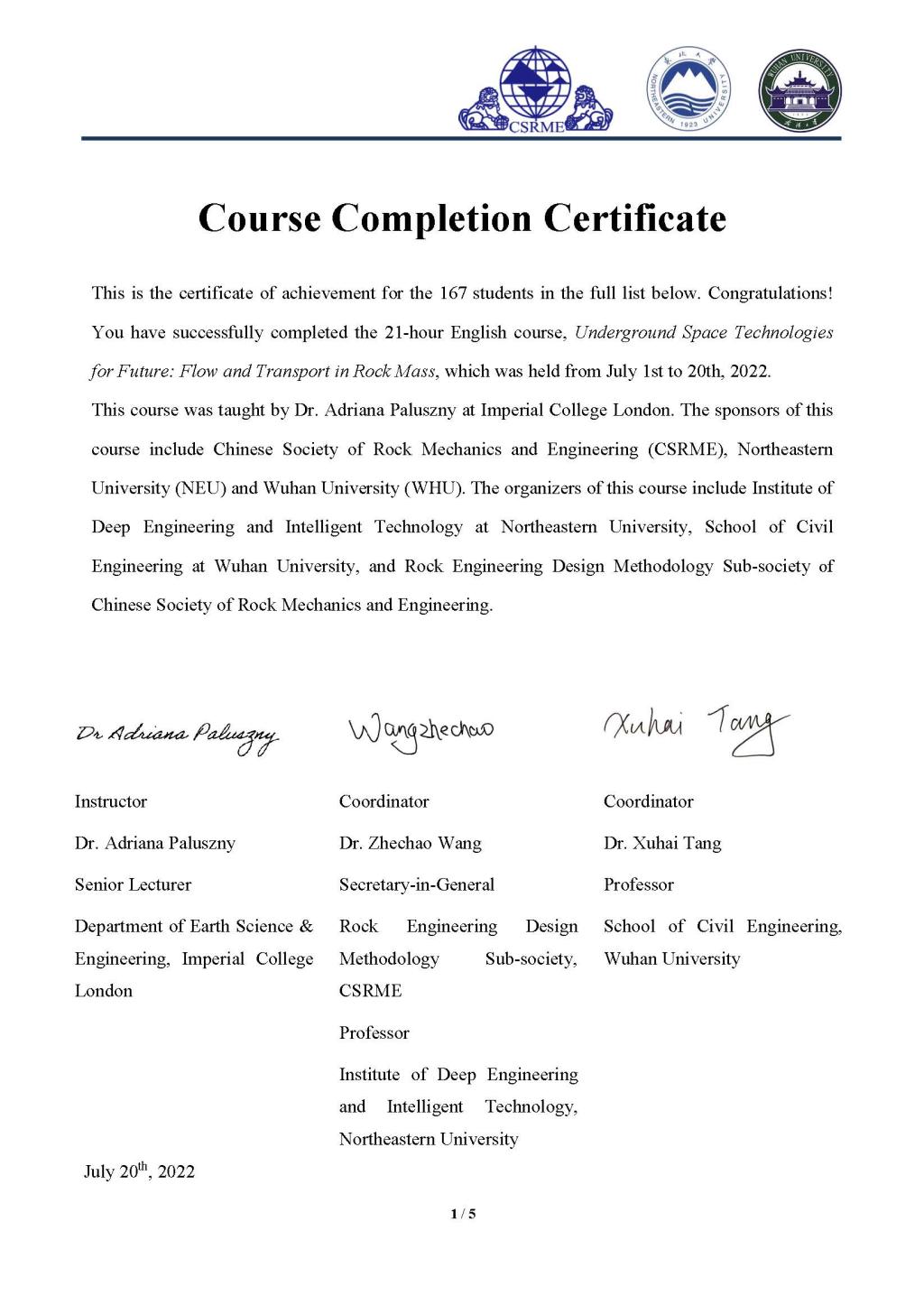 7月1日-20日,m88 app研究生王酒婷、金光辉、张霞、罗理民、张雅各、崔璨、李存、刘雨卉、马杨昊、田延冰等10名同学参加了“面向未来的地下空间技术:岩体中的流动与输运”国际高端课程,并取得结业证书。