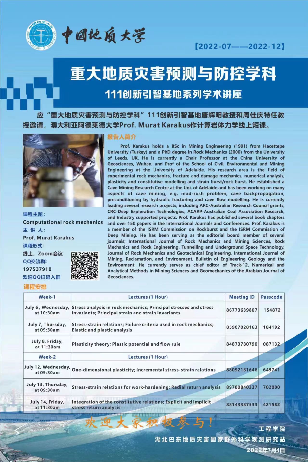 该讲座由中国地质大学工程m88 app和湖北巴东地质灾害国家野外科学观测研究站联合主办,由澳大利亚阿德莱德大学Murat Karakus教授主讲,唐辉明教授和周佳庆特任教授组织,讲座内容为计算岩体力学线上课程,共6学时。