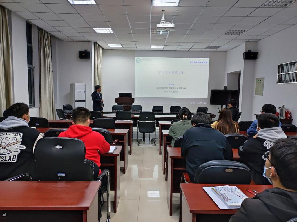 2022年11月17日晚上,m88 app院长、河南省高等学校优秀共产党员周葆春同志在综合实验楼206室为研究生讲思想政治理论课,学习党的教育方针,寄语研究生新生,副院长肖琪聃,研究生班主任马文强和2022级全体研究生参加了本次活动,会议由肖琪聃主持。