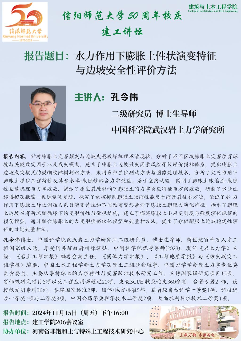 报告人简介:孔令伟博士,中国科m88 app武汉岩土力学研究所二级研究员,博士生导师。新世纪百千万人才工程国家级人选,享受国务院政府特殊津贴,中国科m88 app优秀导师(2023)。现任《岩土力学》主编、《岩土工程学报》编委会副主任,《固体力学学报》、《工程地质学报》与《防灾减灾工程学报》,中国土木工程学会土力学及岩土工程分会理事、中国力学学会岩土力学专业委员会委员。主要从事特殊土的力学特性与灾害防治技术研究工作,主持国家级研究项目10项、省部级研究项目6项以及工程应用课题近20项。发表SCI/EI收录论文360余篇,合著专著2 部,获授权发明专利36件;参编国家标准2部、团体/地方标准5部;获省级自然科学一等奖1项,科技进步一等奖1项与二等奖3项,中国公路学会科学技术二等奖2项、大禹水利科学技术二等奖1项。