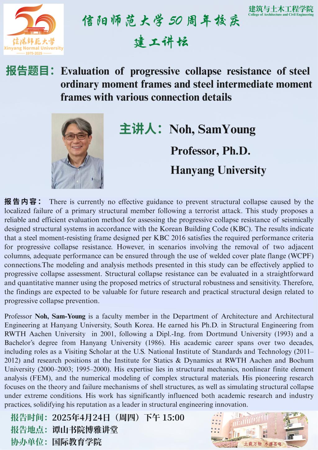 报告人简介:Professor Noh, Sam-Young is a faculty member in the Department of Architecture and Architectural Engineering at Hanyang University, South Korea. He earned his Ph.D. in Structural Engineering from RWTH Aachen University in 2001, following a Dipl.-Ing. from Dortmund University (1993) and a Bachelor’s degree from Hanyang University (1986). His academic career spans over two decades, including roles as a Visiting Scholar at the U.S. National Institute of Standards and Technology (2011–2012) and research positions at the Institute for Statics & Dynamics at RWTH Aachen and Bochum University (2000–2003; 1995–2000). His expertise lies in structural mechanics, nonlinear finite element analysis (FEM), and the numerical modeling of complex structural materials. His pioneering research focuses on the theory and failure mechanisms of shell structures, as well as simulating structural collapse under extreme conditions. His work has significantly influenced both academic research and industry practices, solidifying his reputation as a leader in structural engineering innovation.