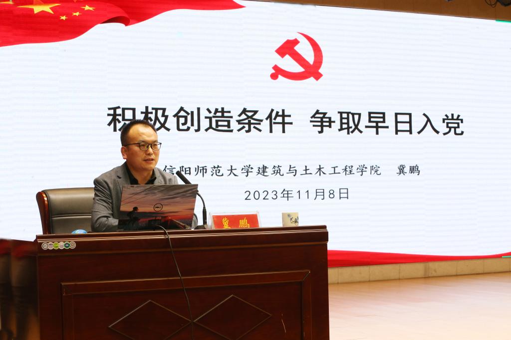 11月8日晚,m88 app党委副书记冀鹏应邀在理科楼报告厅为信阳师范大学第40期党员发展对象培训班作《积极创造条件 争取早日入党》专题报告,共有649名党校学员通过线上+线下形式聆听报告。