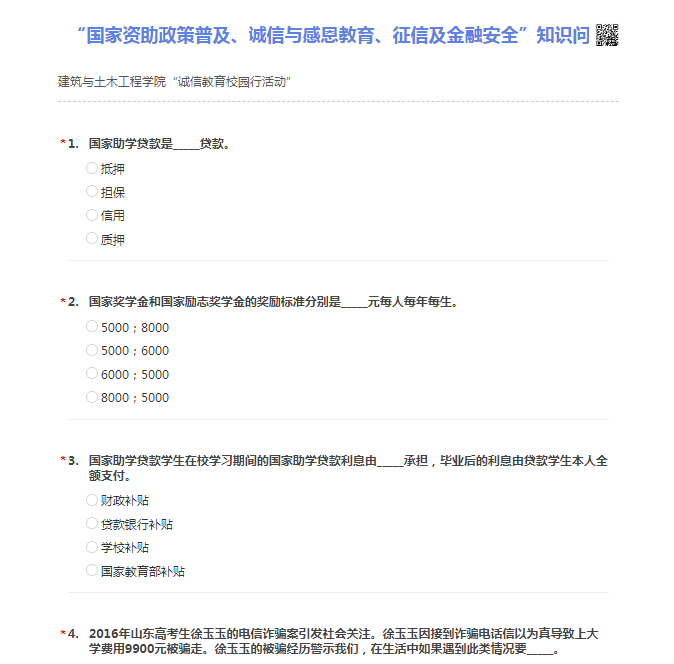 6月13日-6月14日,m88 app利用网络,开展了“国家资助政策普及、诚信与感恩教育、征信及金融安全”知识问卷,设计单选题20道,多选题10道,简答题1道,参与网络答题的员工有519人,达到m88 app在校生人数的97%,员工参与率高。