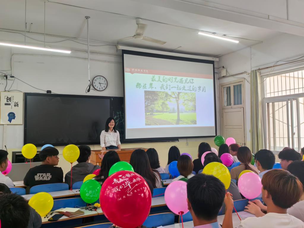 张海燕以视频短片的方式带领同学们回顾了一起走过的四年大员工活的美好时光。同学们汇报了自己在校四年来取得的成绩,并表达了对母校的感恩、不舍和美好祝愿。为了激励同学们心怀梦想,砥砺奋斗,张海燕与同学们许下毕业后的“十年之约”,每位同学写下毕业十年里的梦想,装进45颗“梦想胶囊”,约定十年返校聚会时一起打开“梦想胶囊”,见证彼此梦想的实现。