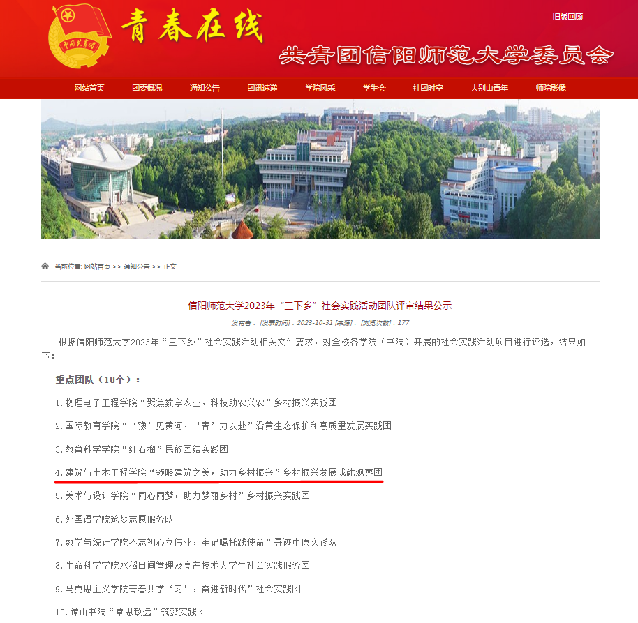近日,信阳师范大学2023年“三下乡”社会实践活动评审会公布评审结果,m88 app的“领略建筑之美,助力乡村振兴”乡村振兴发展成就观察团被评为重点团队。