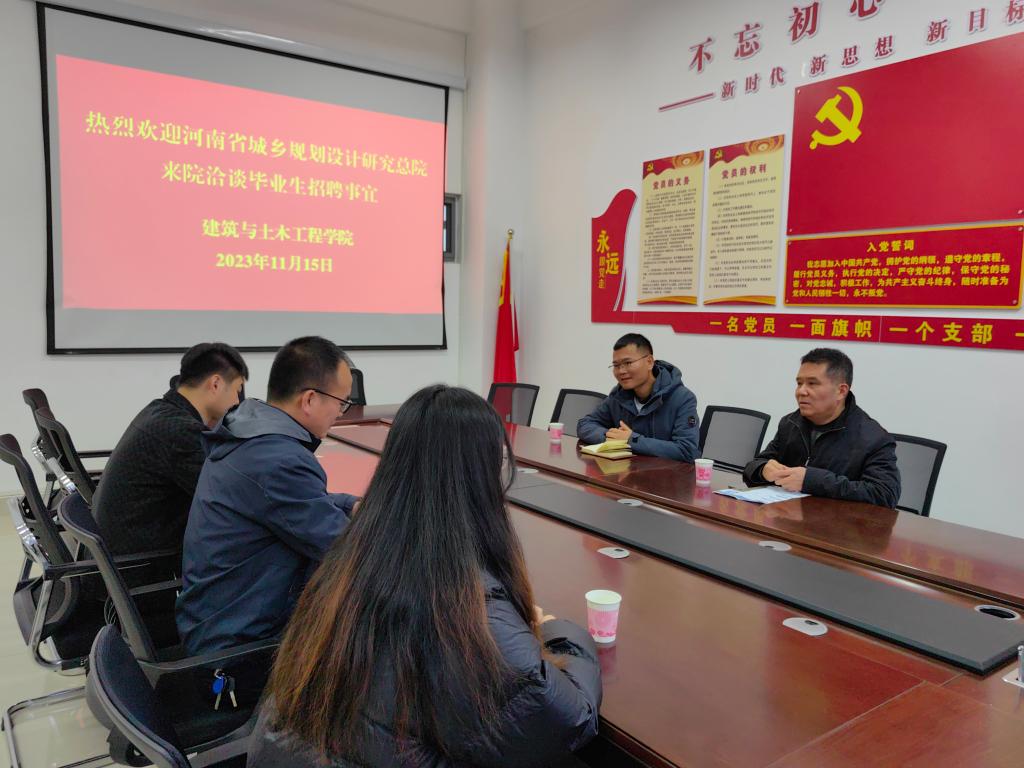 11月15日下午,河南省城乡和规划设计研究总院股份有限公司交通院院长吴黎、总工董君来院对接2024届毕业生招聘事宜。建筑与土木m88 app党委副书记冀鹏与吴黎一行在综合实验楼南楼402会议室进行了座谈。