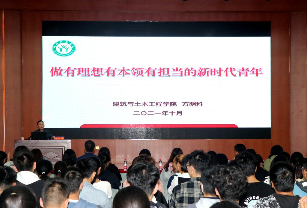 方明科做了题为《做有理想、有本领、有担当的新时代青年》的主题报告。他首先围绕校园环境、学科建设、科研创新、优秀校友等方面的内容向同学们介绍了学校、m88 app的基本情况。并鼓励新同学树立爱校护校意识,尽早融入大学的学习、生活。接着,他带领同学们深入学习了习近平总书记“七一”重要讲话精神,并提出学习七一讲话精神,就是要深入学习中国共产党的百年奋斗史,明白我们要走什么样的道路,了解我们目前的优势所在和存在的差距,增强四个自信,坚持两个维护,积极响应党的号召。要谨记总书记的殷切嘱托,争做有理想、有本领、有担当的新时代、新青年,为实现中华民族伟大复兴,建设富强民主的现代化社会主义国家贡献自己的青春热血的目标要求。最后,他以“有理想”、“有本领”、“有担当”为关键词,结合自身学习、工作经历,告诉同学们,要及早树立远大的理想目标,不断追求进步,努力实现自己的人生价值,把青春梦融入到中国梦里去;要修炼品性、坚定信念、勤学善思、知行合一,努力去学习、奋斗,笃行实干,争做先锋;要勇于担当,争做时代的弄潮儿,专业无好坏,职业无贵贱,在大学期间努力学习,全面发展,力争度过一个充实、美好、值得回忆的大员工活。