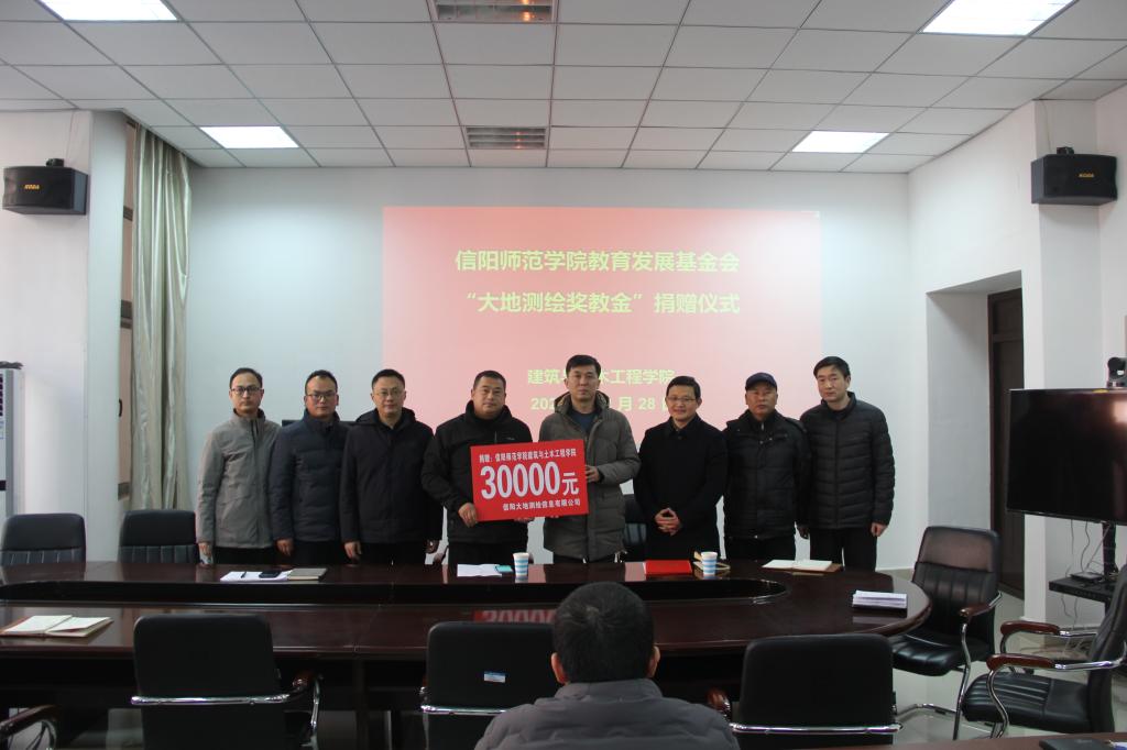 12月28日,信阳师范m88 app“大地测绘奖教金”捐赠仪式在我校m88 app206会议室举行。信阳大地测绘信息有限公司总经理汪波,校对外联络处办公室副主任齐东伟,m88 app领导班子和全体教工参加仪式。仪式由m88 app党委书记方明科主持。