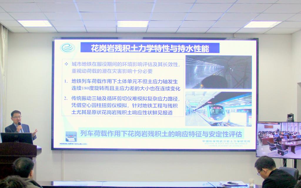 报告会上,孔令伟研究员介绍了他的最新成果:以花岗岩残积土为例,研究了非饱和花岗岩残积土的小应变剪切模量特性,反演出花岗岩残积土的持水特征曲线,并讨论了其力学机理。针对膨胀土灾害频发与边坡失稳破坏机理不清现状,分析了不同区域膨胀土灾害孕育环境与关键致灾因子以及成灾模式,建立了膨胀土边坡致灾因素风险等级评价指标体系,提出膨胀土边坡成灾模式的模糊故障树判识方法;分析了水-力作用下膨胀土胀缩性-裂隙性耦合效应,讨论了原生裂隙条件下膨胀土力学特性与方向效应,分析了膨胀土变形损伤特征,提出了分析膨胀土边坡稳定性演化的改进矢量和法。