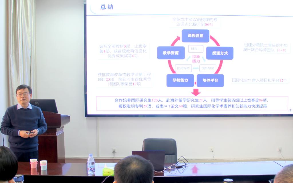 报告会上,赵军教授介绍了河南省研究生高等教育教学成果特等奖“五维融合双向驱动:工科专业卓越研究生国际化培养体系创新与实践”的主要成果:为积极响应习近平总书记提出的“构建人类命运共同体”理念,对接国家“加快培养具有全球视野的高层次国际化人才”需求,落实《河南省“十四五”教育事业发展规划》有关“提高国际化创新型人才培养能力,教育对外开放水平显著提升”发展任务,在国家重点研发计划国际合作重点项目、国家留学基金委人才培养合作项目、国家社会科学基金、河南省教学改革重点项目等29个项目支撑下,依托12个国际化合作育人项目与平台,构建“五维融合 双向驱动”的卓越研究生国际化人才培养体系,实现中外文化交融的国际化育人资源、育人空间、育人模式,为新常态下培养具有国际视野和全球胜任力的高层次创新型人才提供了有价值的行动方案。
